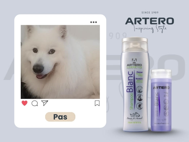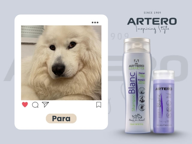 This dog`s white coat had faded to a yellow tone. The owner turned to our Artero Blanc Shampoo to restore its natural color. After just one use, the transformation was striking: pure, bright white fur with a soft, fresh finish.